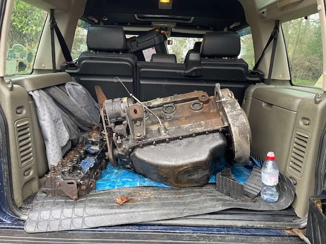 We then had a great deal of fun trying to get the old engine into the back of the Disco. At one point, I was towing the engine along a board of wood to get it into a suitable position to get the hoist on it. I then backed up so we could creatively wiggle it into the boot and pack it in with plenty of old rags and blankets to attempt to save the carpet. The boot is usually occupied by a dog, so there is already a set of waterproof matting and such down which should stop it getting too filthy.